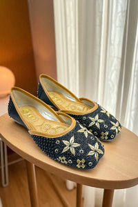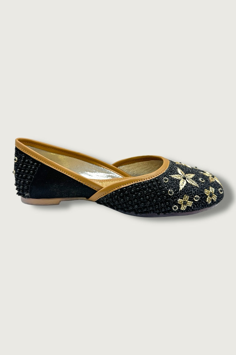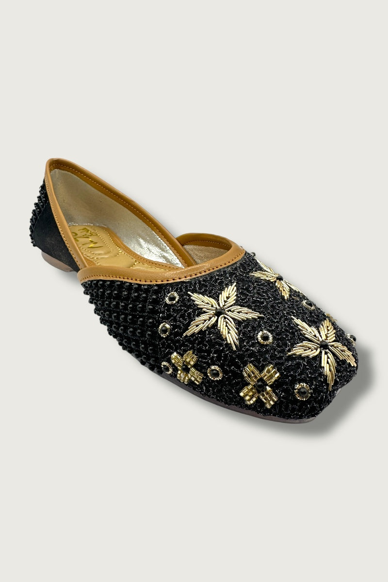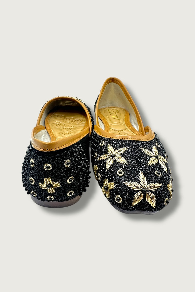 Description: A statement piece of elegance, this handcrafted black jutti with golden embroidery is designed to make every step glamorous. Perfect for weddings, parties, and festive nights.