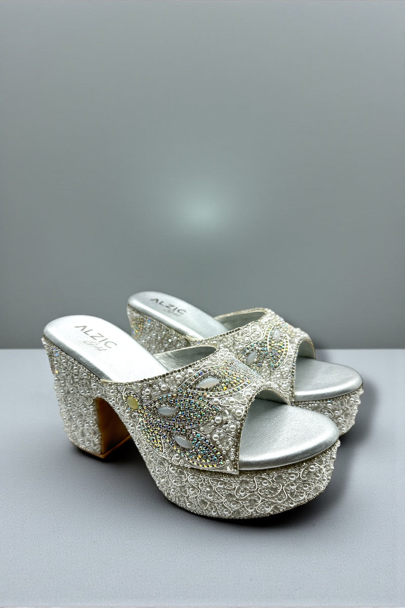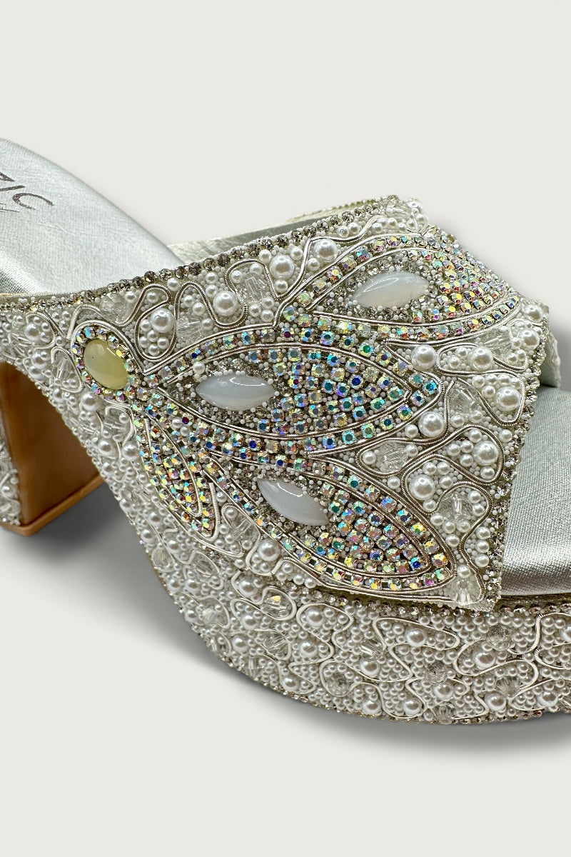 Step into elegance with these handcrafted Silver platform heels, embellished with premium pearls, shimmering stones, and intricate embroidery. Designed to elevate your festive and bridal looks with unmatched glamour and comfort.