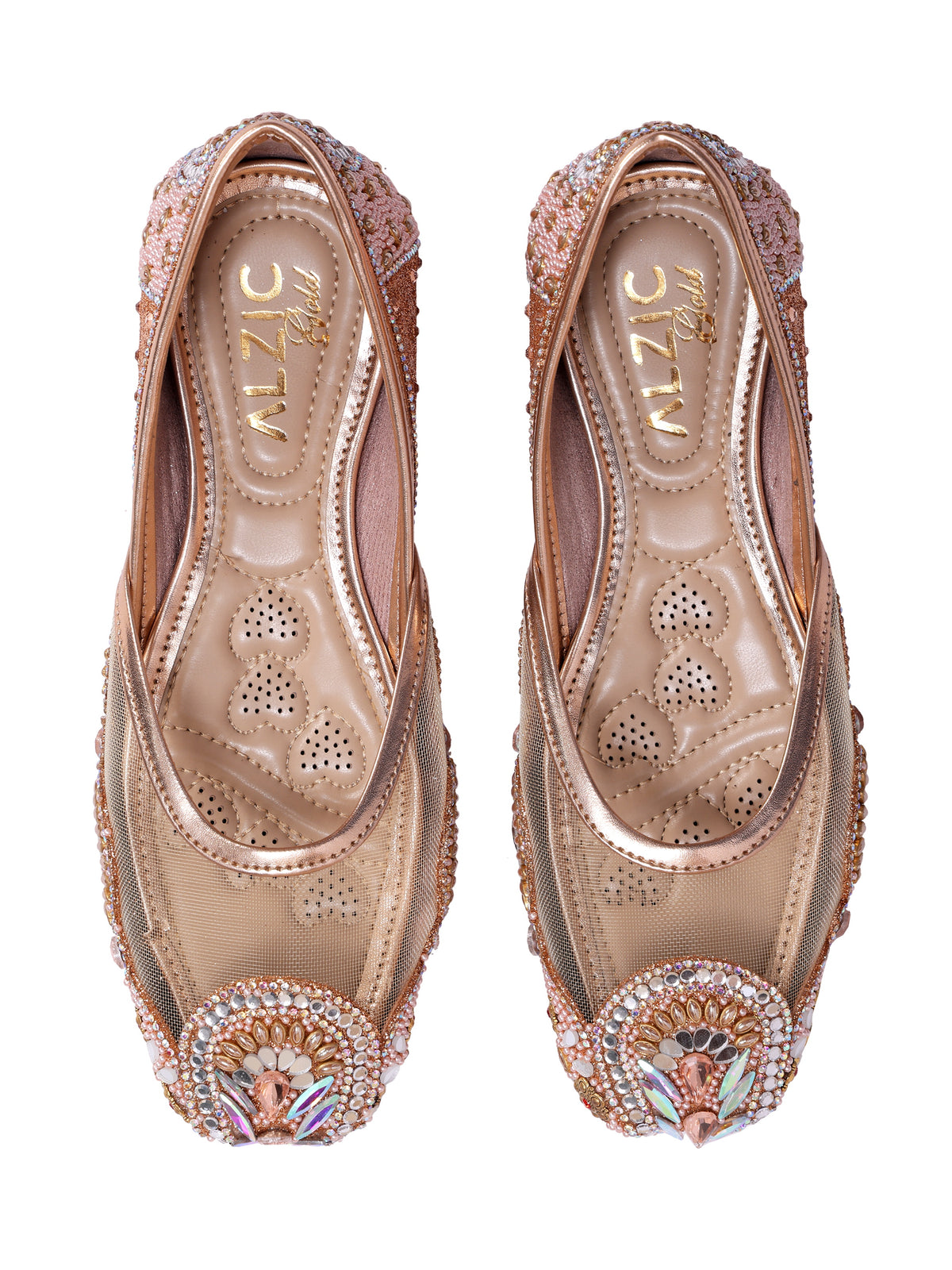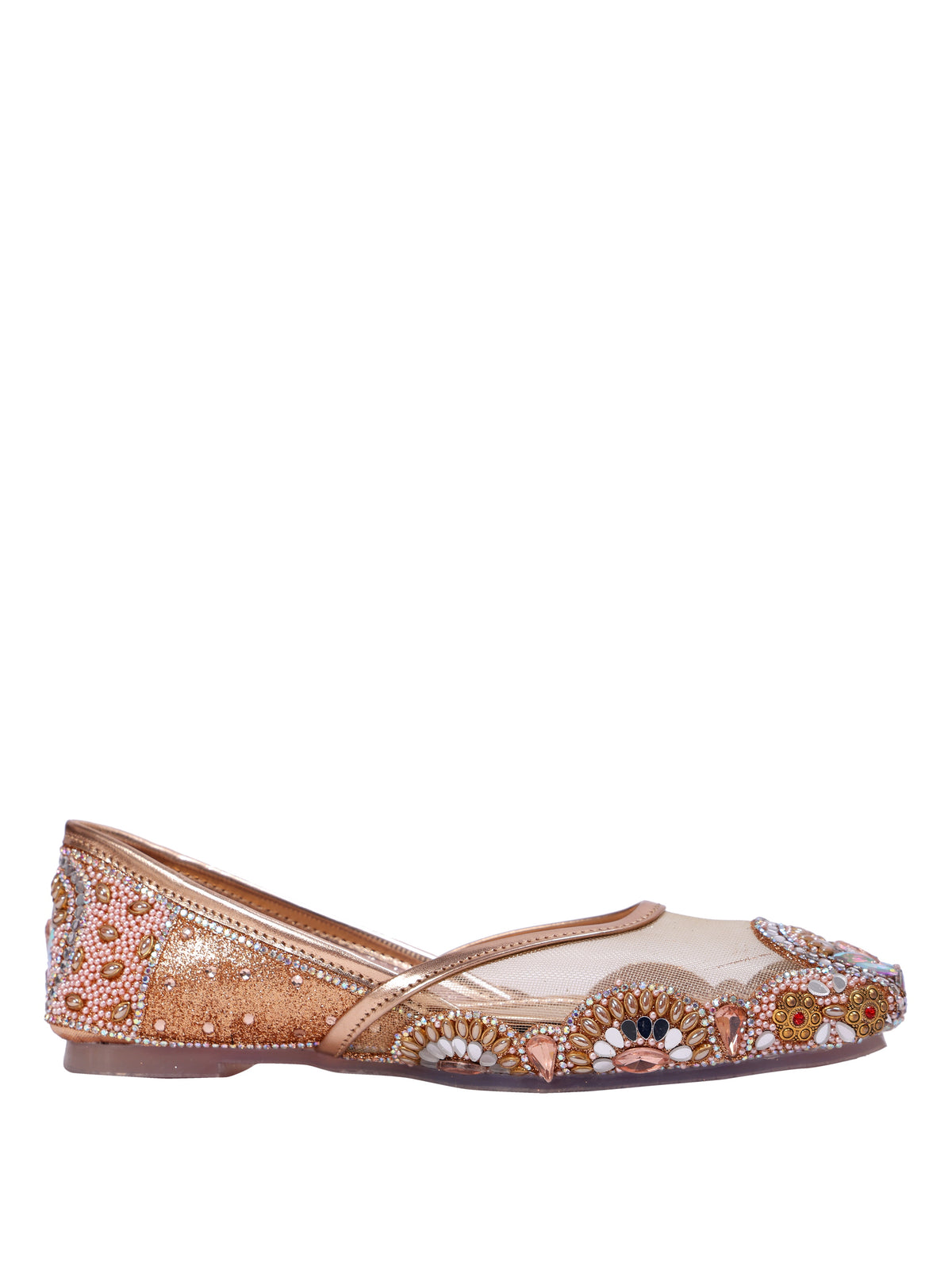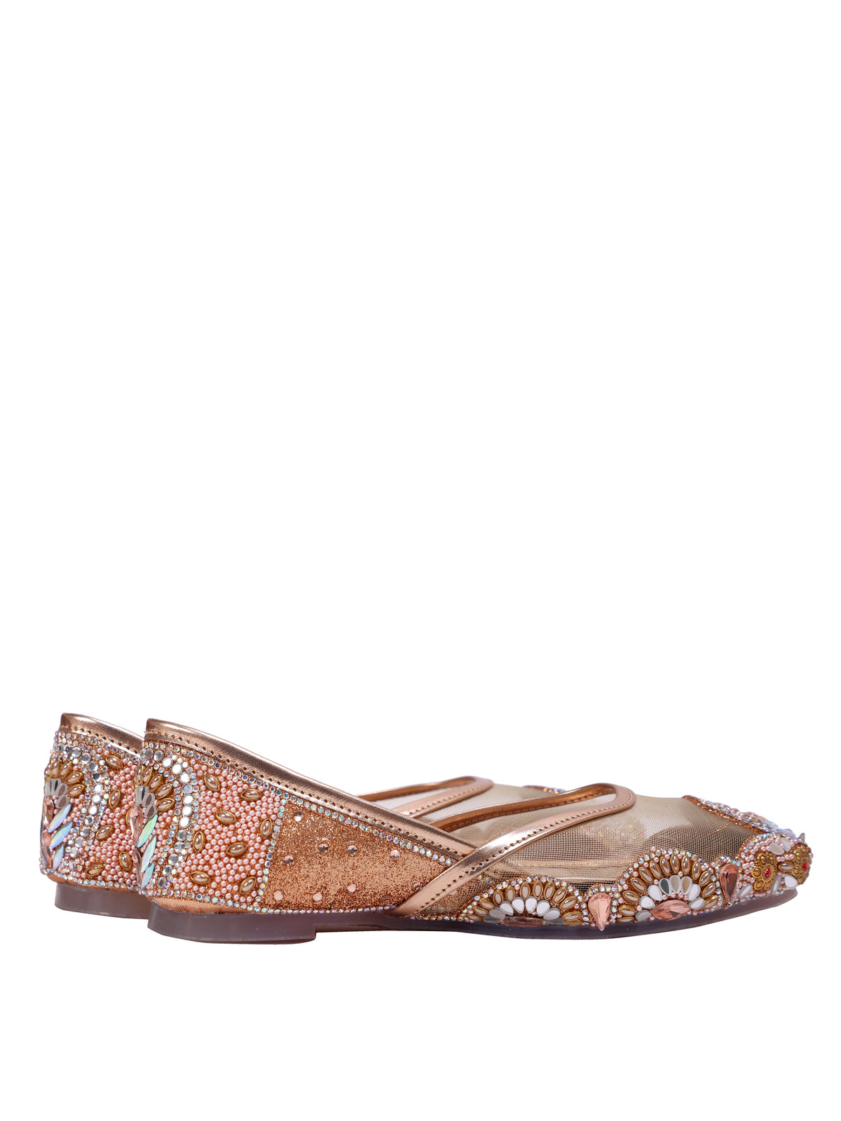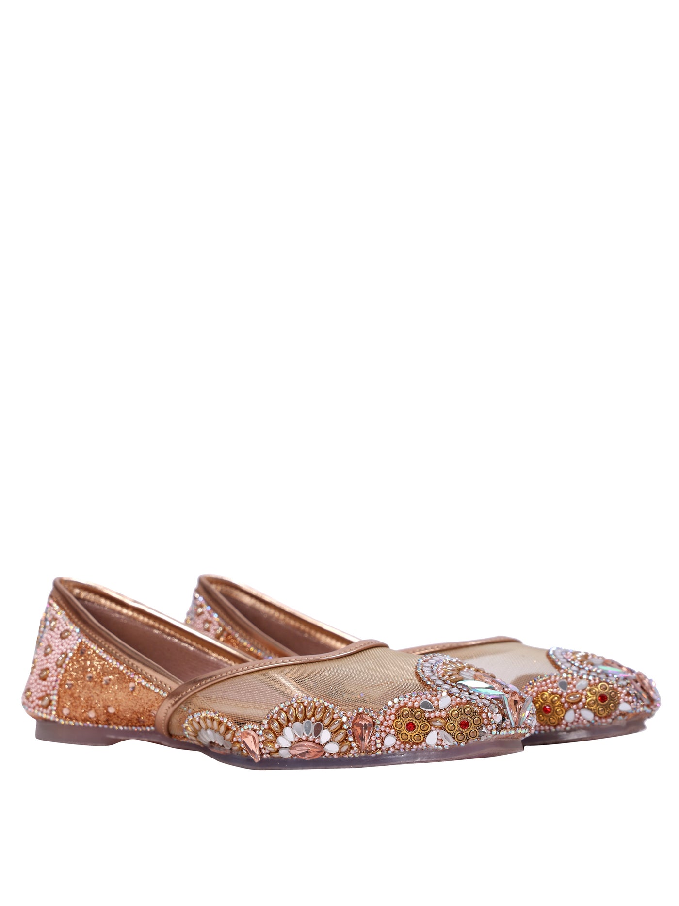 Step into pure royalty with the Malika Al Zahab Juttis — a design inspired by golden palaces and heirloom jewels. Crafted on a luminous champagne-gold base with fine mesh detailing, this pair is adorned with intricate hand-set stones, pearls, and crystal embellishments in warm blush and gold hues. Every element is thoughtfully placed to create a regal, statement look while still feeling graceful and refined. Perfect for brides and grand celebrations, these juttis bring majestic charm without sacrificing comfort.