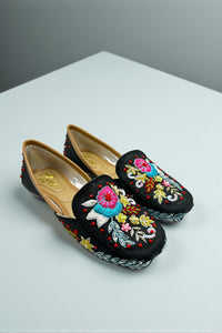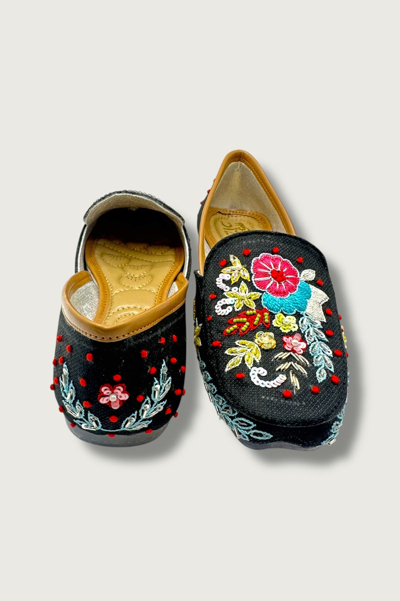 Step into elegance with our Midnight Black Handcrafted Juttis, designed to bring a splash of color to your wardrobe. Featuring vibrant floral embroidery on a bold black base, these juttis combine tradition, artistry, and modern style seamlessly — perfect for festivals, parties, and casual outings.