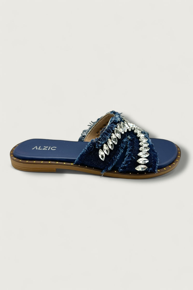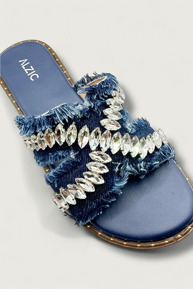 Description: A chic blend of raw-edged fabric straps and sparkling crystal embellishments, these flats bring effortless glamour to your everyday and festive looks.